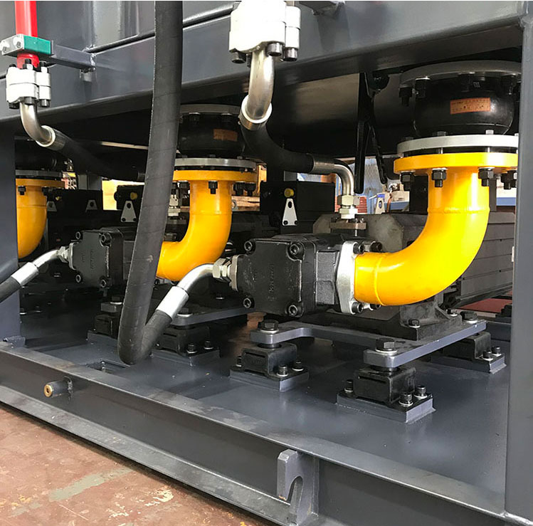 4.3液壓泵站由油箱、高壓泵、電動(dòng)機(jī)、插裝閥等組成,油箱系鋼板焊接。油箱采用封閉式油箱,設(shè)有清洗窗口和放油塞,使清潔換油方便。油泵吸油口裝有吸油濾清器,確保油的清潔度,保證油泵和閥的使用壽命,泵站帶有水冷散熱。